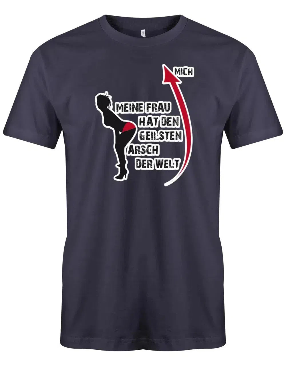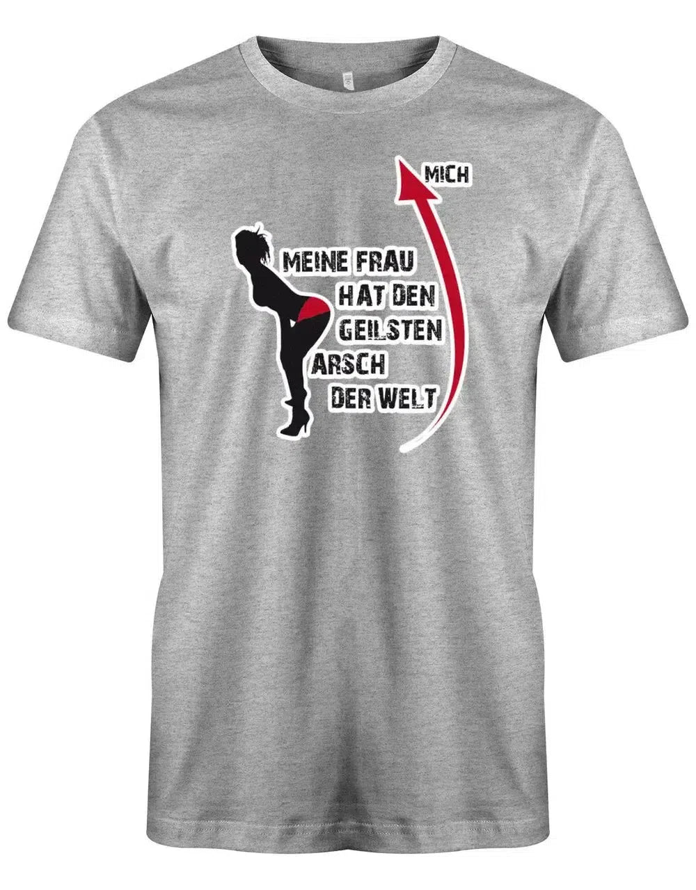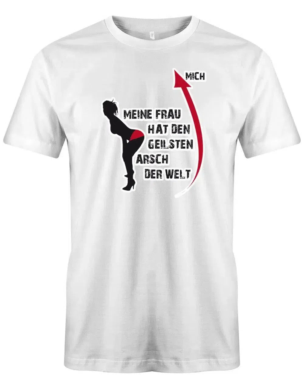 Mit diesem lustigen Sprüche T-Shirt Herren setzt du ein eindeutiges Statement: „Meine Frau hat den geilsten Arsch der Welt“. Das Motiv zeigt eine Silhouette mit auffälligem roten Detail und sorgt garantiert für Lacher und Aufmerksamkeit.